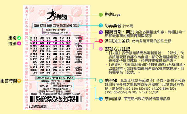 注意事項:彩券銷售後如遇有加開期數之情況,預購及多期投注之期數將順延。若彩券上的資料和電腦紀錄的資料不同,以電腦紀錄資料為準。